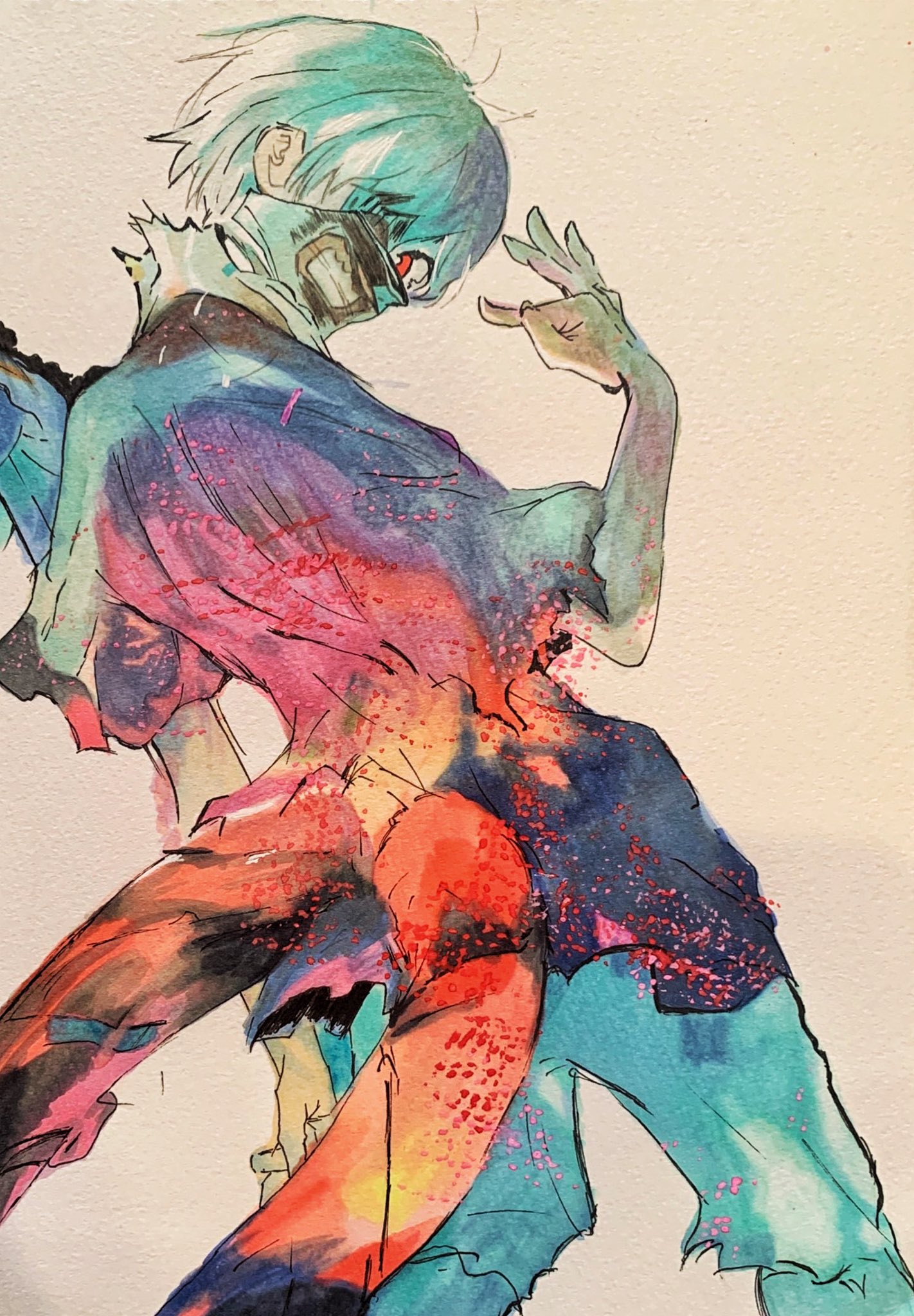 Tom 金木くん またまたスイ先生の模写 カッコイイ この色合いとか本当に好き 描いていて楽しい 背景を描こうか迷う とりあえず ここで一旦完成にしようかな ほぼcandoのマーカーで描いた 4 10 金木研 模写 アナログイラスト 金木研